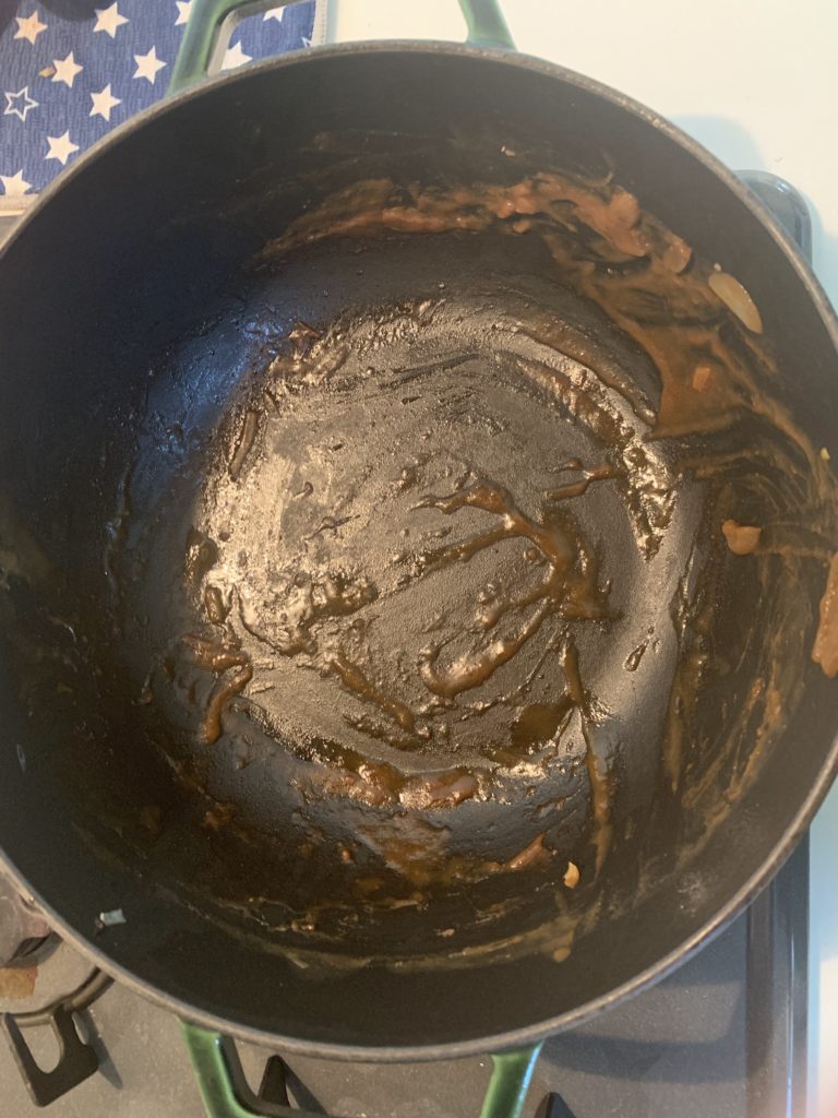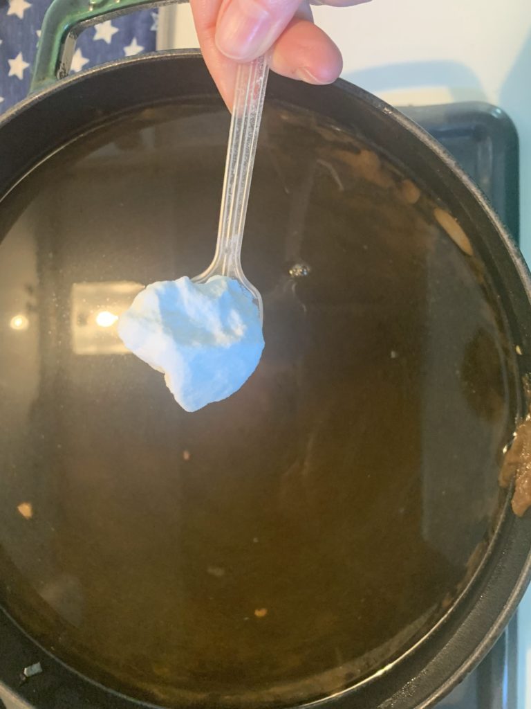 そこに重曹を入れて沸騰させます。重曹の量は、神経質になることはないです。お鍋の大きさで大さじ1~3くらい。私はこのお鍋だと大さじ山盛り1くらい入れてます。その後、吹きこぼれないように弱火にして10分ほどしたら火を止めてそのまま放置して冷まします。ぬるま湯になるくらいまで冷ましても、面倒くさかったら次の日まで放置してもどちらでも大丈夫。