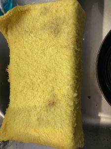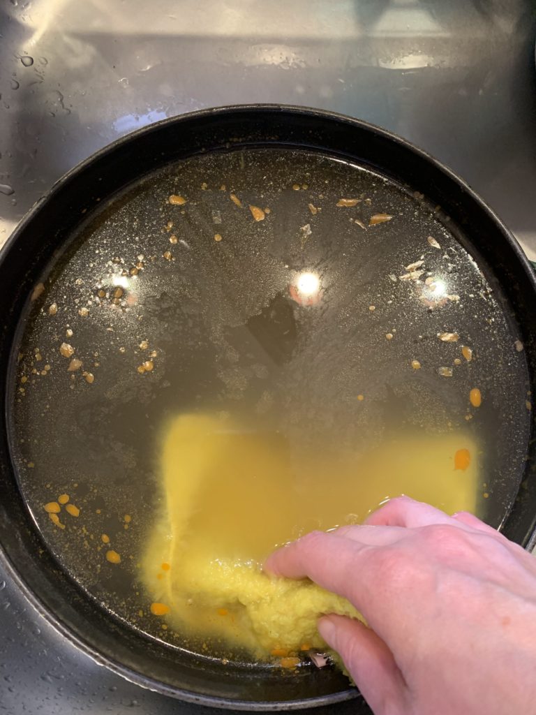 さて、パルスイクロスでクルクルしたお鍋。油が少し残っているし表面は洗っていないのでスポンジで洗ってみます。
