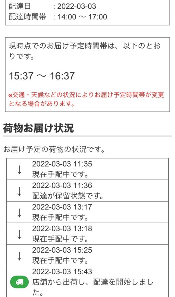 配送時間近くになると、配送時間の目安がわかるようになります。この時14時から17時の間に配送で15:37~16:37とわかるようになったのは15時くらいでした。もう少し早くわかると嬉しい。ですが、子供のお迎えに少しだけ出たいけど、、といったような場合は助かりますね♪配送時に不在だと再配送になって手数料がかかってしまうようなので必ず在宅している時間にする必要がありそうです。